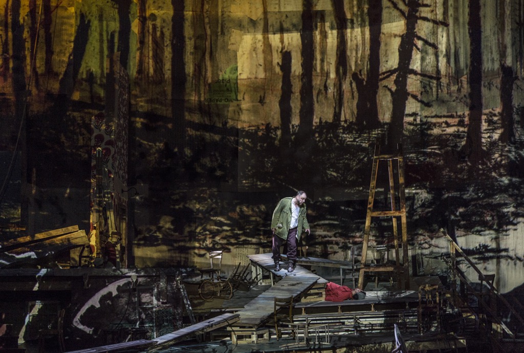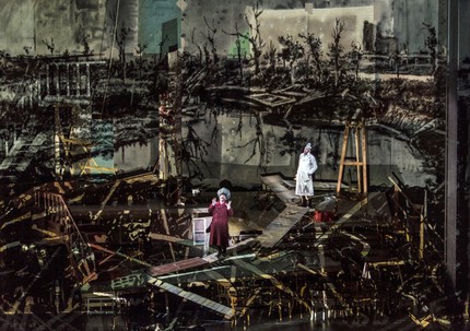 У. Кентридж своим героям этого пространства не оставляет. Точнее, забирает у них даже то немногое, что отпущено персонажам Бюхнером-Бергом: в новом зальцбургском спектакле сама сценография (авторы грандиозной инсталляции на тему ужасов войны — Сабина Тейниссен и Кэтрин Мейбург), покрытая патиной эсхатологических видеопроекций, делает невозможным рассматривание мизансцен, которых в строгом смысле в этой постановке почти нет (образы высвечиваются, шевелятся, поют, исчезают). Мы не только не видим на сцене ожидаемого по сюжету страдания: мы даже ожидать его перестаём, потому что... красиво.