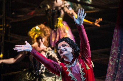Нам словно говорят: «Смотрите, мы можем всё, но будем делать так, как надо!» Имеется в виду: так, чтобы было «круто» и «прикольно», но, как и на сей раз, шло вразрез с эстетикой самóй оперной истории, заложенной в либретто и музыке. В противном случае режиссура этого спектакля не была бы тем «модным продуктом» в блестящей золотистой обертке, который просто обожает преданная «Геликону» клубная публика, воспитанная именно на таком примитиве с гламуром и свято верящая в то, что это и есть опера…