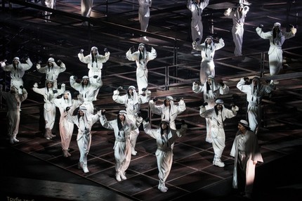 Но сценографическая и костюмная концепция постановки, предложенная художниками Игорем Нежным и Татьяной Тулубьевой, режиссера, по-видимому, во всём устраивает. Ее дополняет весьма эффектная «партитура света» Дамира Исмагилова и типично эстрадная, навязчиво ритмичная движуха, тотально привносимая на сцену хореографом Эдвальдом Смирновым и в итоге