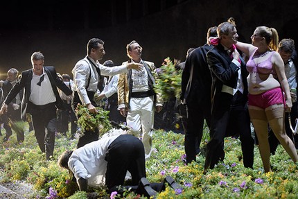 Рискну предположить, что для любителей пострадать, изображающих из себя интеллектуалов, спектакль австралийского режиссёра Саймона Стоуна стал универсальным инструментом для расчёсывания своих психологических травм, детских комплексов и подсознательных проблем. Как шоковая терапия постановка С. Стоуна – вершина неврастенической сублимации: гигантская клумба, заливаемая пивом и уничтожаемая пьяным хором, натуральный дождь, мокрая грязь, жирные полуголые бабы, одна нежирная и абсолютно голая, престарелые трансвеститы и прочий садо-мазо-фейерверк, — почти всё, что нужно, чтобы испытать чувство глубочайшего омерзения. Зачем режиссёру понадобилось измываться над певцами и зрителями, ответить несложно: по всей видимости, какие-то проблемы из прошлого, поскольку то, что творилось на сцене, — очевидно, плод некоего серьёзного внутреннего конфликта глубоко несчастного человека.
