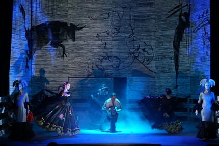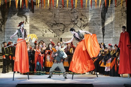 иногда непосредственно вторгающихся в ход событий, а иногда – в интермедийно-символическом аспекте вплетающих в ткань оперной партитуры музыку известной оркестровой транскрипции Родиона Щедрина «Кармен-сюита» (балетмейстер – Мария Большакова, постановка батальных сцен – Леонид Нечаев).