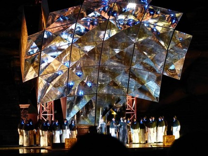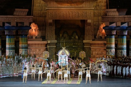 На афише нынешнего фестиваля значилось две «Аиды», одна традиционная и апробированная, фантазия на тему, каким бы мог быть исторический спектакль 1913 года (постановка Джанфранко Де Бозио), и «инновационная», продукт каталонской театральной группы La Fura dels Baus (режиссеры Карлуш Падрисса и Алекс Олле), использующая откровенно цирковые приемы, полная мельтешения, отвлекающая от музыки и отказавшаяся от танцев, которые заменили театром теней во втором действии и механическими зверями в сцене триумфа. Не лишена была поэзии заключительная сцена, когда инженерное сооружение с зеркальной поверхностью сценографа Роланда Олбетера медленно опускалась, накрывая прощающихся с жизнью Аиду и Радамеса.