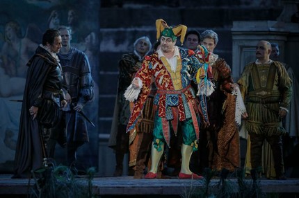Постановка «Риголетто», восходящая аж к 1928 году, не что иное, как тщательная инсценировка либретто (режиссер Иво Гуэрра), включая сценографию Раффаэле Дель Савио, весьма выразительно воспроизводящую на сцене ренессансную Мантую. Этот спектакль — одна из палочек-выручалок летнего фестиваля в Арена ди Верона. Ничем не поражающий, он крепко сбит и неизменно функционирует, особенно когда три исполнителя главных партий на высоте.