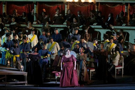 На подмостках Арена ди Верона сценограф Алессандро Камера выстроил копию театра Ла Скала, где, по мысли режиссера, расположился австрийский штаб, а на огромной сцене и окружающих ее древних ступенях поместил артистов хора и миманса в непрерывном движении. В умении «развести» массовые сцены Бернару никак нельзя было отказать! Поворотный круг позволял лицезреть интерьер легендарного театра, где в дни боев миланских патриотов с австрийцами играли оперу Верди «Набукко». Об исторической достоверности речи не было, и многие критики поставили это обстоятельство в упрек Бернару.