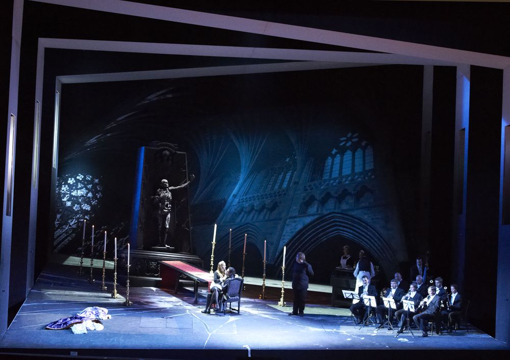 На этом фоне совершенный восторг произвела на меня постановка Ж.-Л. Мариноти. Мифологема «наклонной плоскости» издевательски красовалась в примитивно сбитой, но безумно уместной и первоклассно поданной сценографии (художник — Ханс Шавернох). Скошенные проёмы, умно подсвеченные изображения на задниках, заваленная перспектива на занавесе (художник по свету — Фабрис Кебур). Просто, функционально, профессионально, интеллектуально, хорошо. Костюмы озорные, но в тему (художник по костюмам — Йан Такс): живодёрская для глаза пестрота карнавальных нарядов в финале I акта выглядит настоящим буйством жизни и красок.