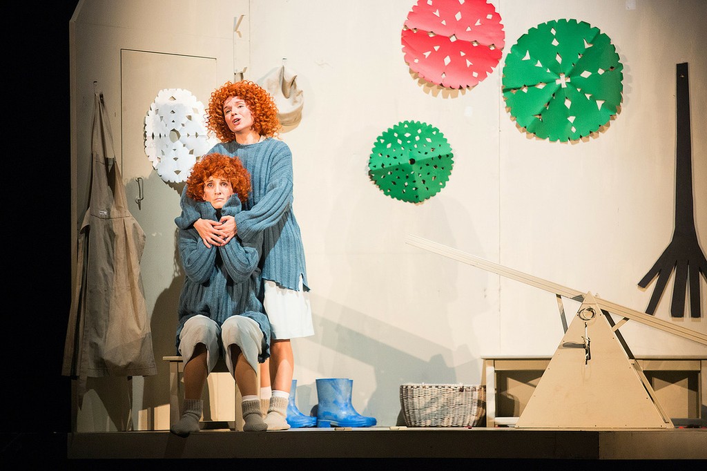 Предрождественская история о маленьких брате и сестре Гензеле и Гретель, растущих в бедной семье вязальщика мётел Петера и его жены Гертруды, начинается в их доме, сценография которого – абстрактный угол-помост, «похожий на планировку» и стоящий посреди темного пространства сцены. Но это неспроста: