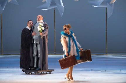 Еще один участник старого спектакля – баритон Евгений Поликанин. И на сей раз в образе Дона Карлоса (приятеля Мендозы), перемещаемого по сцене на колесной тележке, словно статуя «каменного гостя», он сполна убеждает и актерски, и вокально. Впечатляют, в целом, и работы еще не названных певцов: Денис Макаров (Мендоза), Лариса Андреева (Клара), Инна Клочко (Луиза), Пётр Соколов (Фердинанд), Александр Нестеренко (Дон Антонио). Но и весь ансамбль монахов и послушников мужского монастыря во главе с его настоятелем Отцом Августином (Феликс Кудрявцев) обручает нас с Прокофьевым так нерушимо мощно, что ключевую сцену спектакля – апофеоз гипертрофированного до предела гротеска – не забыть уж вовек!