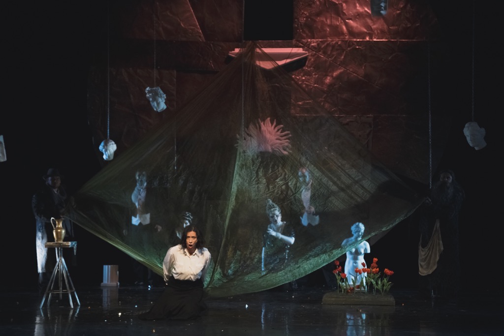 В финале этой сцены в дом Коллатина в отсутствие хозяина вторгается Тарквиний, которому по закону гостеприимства Лукреция предлагает ночлег: желание овладеть ею – для него давно уже словно наваждение! В воздухе отчетливо витает состояние саспенса, но мир Лукреции начнет рушиться во втором акте: круг жизни, захватывающий ее в сцене после антракта, буквально перевертывается вверх дном и начинает раскачиваться в такт с натиском Тарквиния так сильно, что точка возврата к прошлому исчезает навсегда. Вторая сцена этого акта (финальная в опере) – пронзительный монолог Лукреции с ярко красными цветами, которые она просит служанок отослать мужу как символ своей потерянной чистоты, но подавленные происшедшим, они страшатся исполнить ее просьбу. Символ суицида главной героини – падение с высоты круга жизни принадлежащего ей газового шарфа-накидки. Жизнь человека порушена и отнята, и к финальному апофеозу, с которого Тарквиний, понятно, давно уже сбегает, поспевают Коллатин и Юний: звучит страстная молитва, призыв к человечеству о смягчении несправедливого и жестокого общественного уклада. Спектакль всецело захватывает напряженной динамикой и драматизмом, и на сей раз это безусловный постановочный шедевр, большая удача режиссера и всего коллектива!