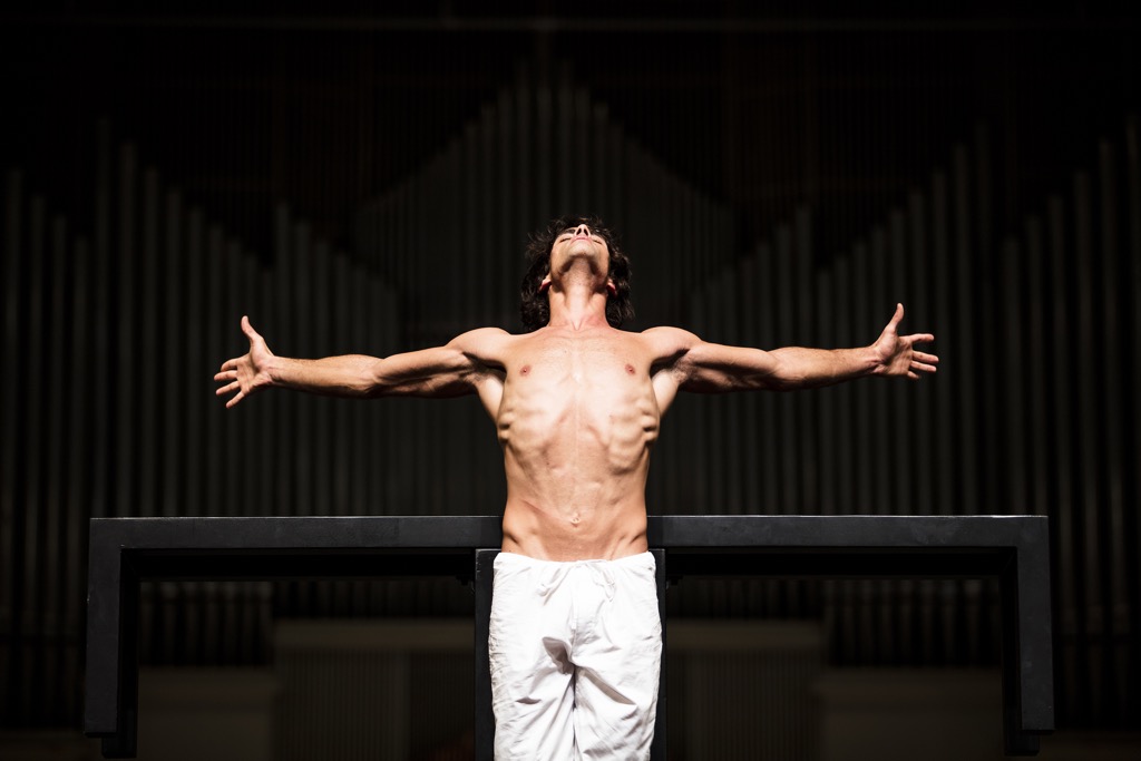 В начале спектакля Иисус, раз он Сын Человеческий, незаметно возникает из массы всего ансамбля. Сцена на Голгофе, возводимой незадолго до финала спектакля из обыкновенных прямых скамеек (жестких банкеток) – кульминация этой выделенности. В финальных сценах Иисус, сошедши с креста (но не сошедши, а вознесшись на Небеса, пройдя через земные муки ради искупления грехов человечества), снова сливается с ансамблем. Этим хореограф словно подчеркивает, что отныне Иисус живет в каждом из нас. И сие наводит на мысль, что весь танцевально-пластический рисунок спектакля – это не написанная Бахом партия сценической пластики, рождаемой движением и покоем танцовщиков, их позами и мимикой, элементами силовой акробатики и статикой жеста, динамикой взрывной турбулентности сольных па и заведомо сложными, подчеркнуто ассиметричными, иррациональными фигурациями как ансамблей, так и массовых сцен.