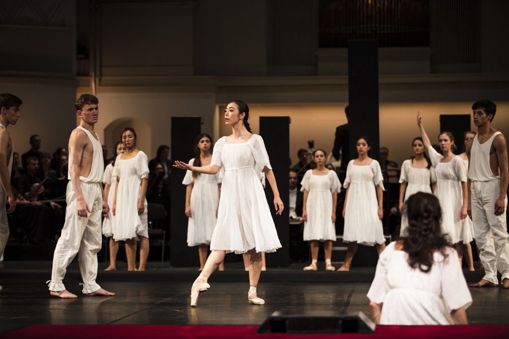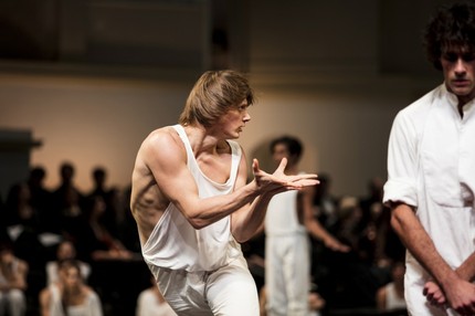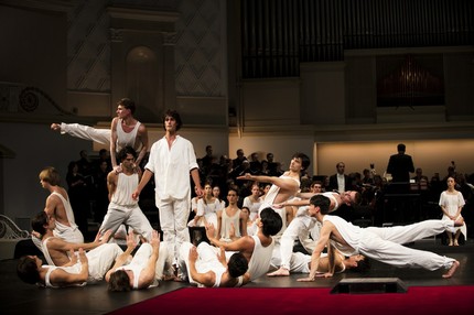 Это исходный рубеж для возникающего на сцене ансамбля из 41 танцовщика в белых свободных одеяниях – неоромантизм в чистом виде, не отягощенный конкретикой! Вслед за музыкой танцевально-пластическими фигурациями постепенно начинает обживаться не только большое «открытое всем ветрам» пространство партерного подиума, но и проходы зрительского амфитеатра: свободно перемещаясь по ним и время от времени присаживаясь на ступеньки, какая-то часть ансамбля сливается со зрителями. Ясно, что и на сей раз новая сценическая среда спектакля неизбежно повлияла на его новую настройку. Привычные для артистов мизансцены и порядок движений, а также живой контакт труппы с залом в форме вылазок в зрительскую часть приобрели новые, подчас весьма неожиданные ракурсы. Нет сомнений, работа в этом плане проделана колоссальная, ведь бессюжетная танцевально-драматургическая композиция предстала выстроенной «с точностью до миллиметра».