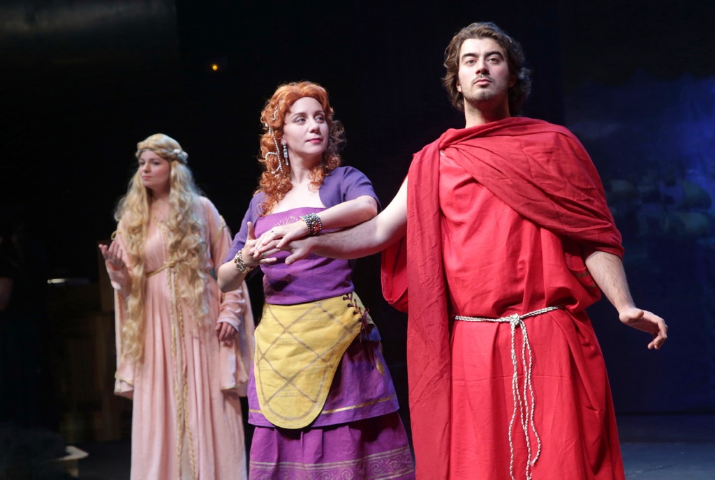 Весьма продолжительное действо с одним антрактом (порядка десятка картин, деление на акты в которых первоначально отсутствовало) теперь явно поделено на пролог и пять актов («Плач» Ариадны звучит во второй картине четвертого акта). Действо с условно традиционными, хотя и вполне адекватными костюмами из театральной подборки, назвать постановкой, спектаклем в привычном смысле сложно. Это чисто студийный театр, и его визуальное содержание – минималистский сплав абстракции подручной сценографии и, в известной мере, реалистичности довольно ярких, создающих настроение костюмов. Это театр в эстетике workshop, но театр без профессионального режиссера и художника.