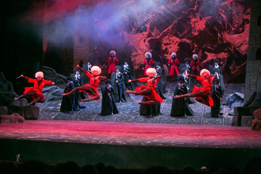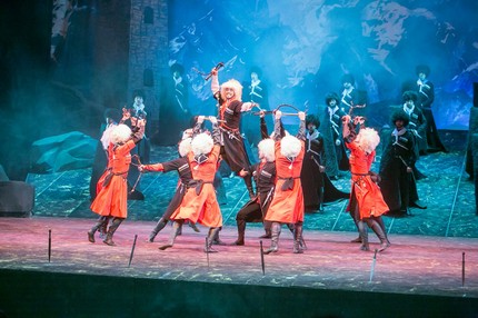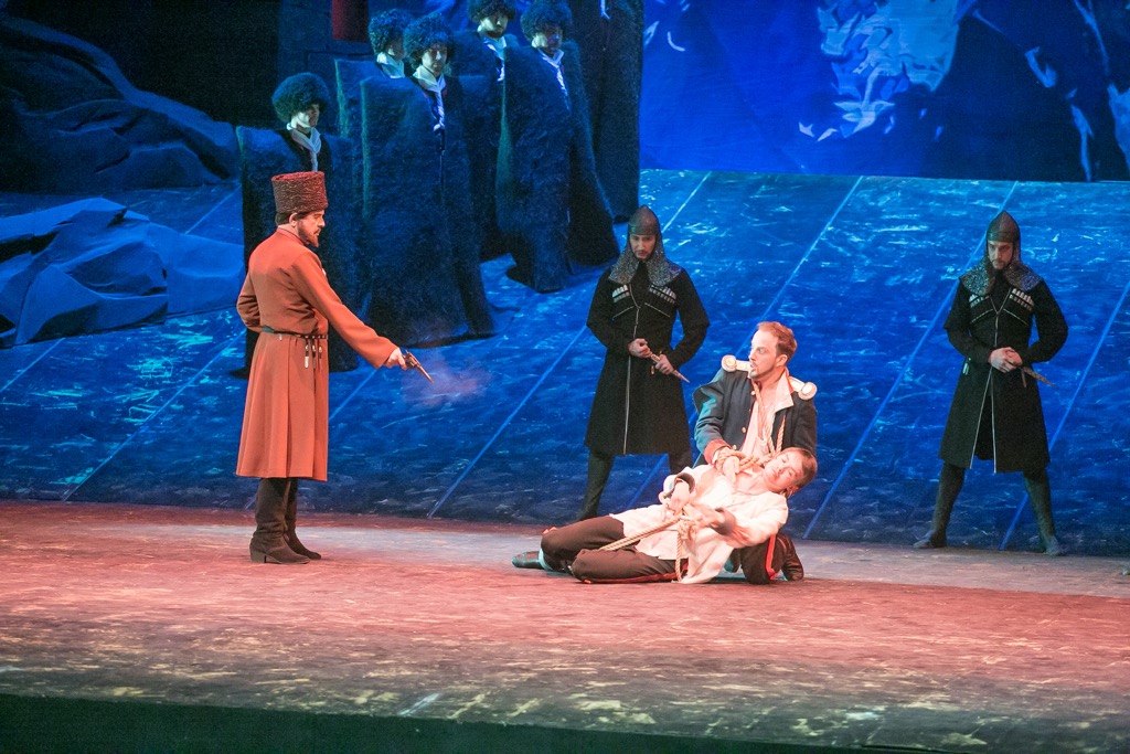 Этому спектаклю присущи черты постановочной ораториальности, но его можно даже назвать и оперой-балетом: пусть основной пласт – вокально-хоровой, роль танцевального элемента чрезвычайно велика. Музыкально интересные, но вряд ли намертво врезающиеся в память вокальные номера, в спектакле, конечно же, есть, и открывать их – ни с чем не сравнимое меломанское удовольствие! Но соперничать в популярности с зажигательной лезгинкой в блистательном исполнении артистов и солистов балета им суждено вряд ли! Такова уж музыка Кюи: вокальные номера – ровные, спокойные, довольно статичные, как и само высеченное из эфира поэмы либретто. Явный эмоциональный драйв возникает лишь в ряде хоровых и симфонических сцен. Зачастую танцевальные вставки как раз и связаны с хоровыми номерами, но музыкальная масштабность их полотен всё же довольно скромна.