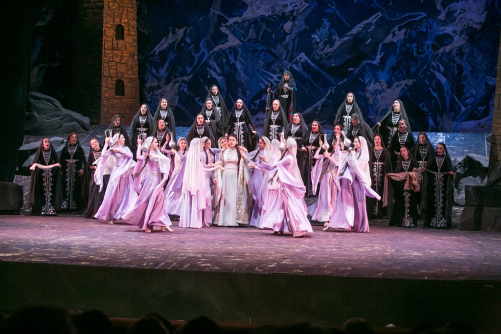 Большинство сцен выдержано в эстетике реализма романтической плакатности, но ряд комбинированных абстрактных эпизодов-связок, в которых сквозное развитие достигается за счет пластических средств действенной хореографии, обусловленной либо батальными, либо дивертисментными включениями, теперь выполняют в опере функции балетных pas d’action. Так что роль хореографа спектакля на сей раз живо перекликается с ролью режиссера. Хор в нем поначалу даже принимаешь за миманс, ибо в предрассветной дымке зачина спектакля мужская хоровая группа джигитов в черкесках и бурках под звуки молитвы словно возникает из гор, а затем под бурками-«горками» превращается в «живые валуны», слагающие горные кряжи. При этом функции хористок в национальных костюмах (платьях с богатой расшивкой серебром) вполне традиционны.