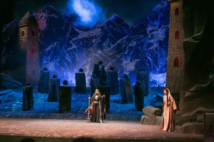 Задник сцены – романтический горный пейзаж, по флангам сцены – две сторожевые башни-вышки, между ними – довольно крутой наклонный скат, словно скрывающий от нас аул непокорных горцев и выносящий действие сюжета на довольно глубокую авансцену, по бокам которой приютились живописные каменные глыбы. Сцена то скрывается, то открывается за грандиозным суперзанавесом, воспроизводящим известное панорамное полотно «Штурм аула Ахульго» Франца Рубó (1856–1928), русского художника-баталиста французского происхождения. Во взаимодействии с «партитурой света», четко выверенной художником-осветителем из Эстонии Неэме Иые, суперзанавес каждый раз изящно легко «меняет театральную декорацию», что создает иллюзию новых сценических локализаций.