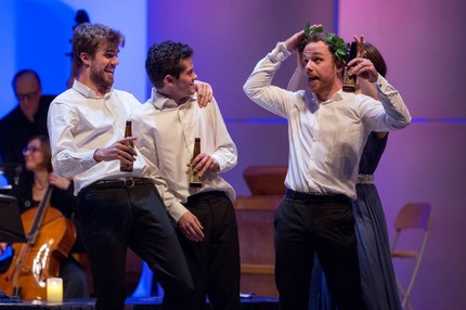 Весьма удачная склейка фрагментов из семи-опер Пёрселла «Тимон Афинский» и «Пророчица» стала центральным игровым эпизодом второго отделения на тему Бахуса, вызвавшим прилив оживления публики. В первом отделении аналогичную роль аниматора в зале взял на себя кэтч «The singing club». Но в этом пастише, в этой дивной английской сюите, ансамбль ярких, сочных, прекрасно поставленных голосов был уверенно хорош не только в жанровых сценах. И в абстрактно-лирических эпизодах он стопроцентно предстал потрясающе живым и нежным ансамблем харизматично-ярких молодых артистов.