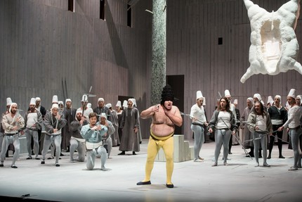 Рамаз Чиквиладзе в роли Мефистофеля предстал в полураздетом виде: его костюм состоял из обтягивающего трико лимонного цвета и черного головного убора, как две капли воды напоминающего папскую тиару. По мнению автора, желающей отвести от себя возможные упреки в чрезмерной стыдливости, не стоило выпускать весьма полного артиста в подобном виде, не говоря уже о том, что ему, должно быть, было нетепло пропеть основную часть партии полуголым.