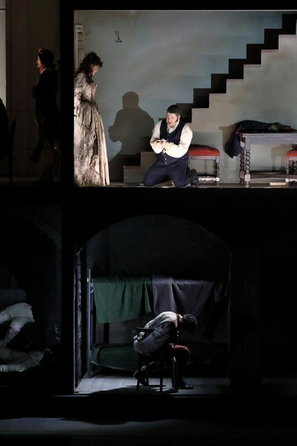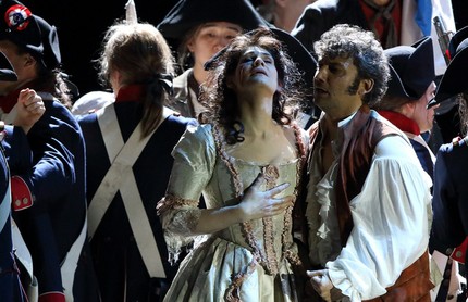 У Йонаса Кауфмана (Андре Шенье) уже около шести месяцев проблемы с голосом, и целесообразность подобных вокально ограниченных выступлений представляется сомнительной. В салоне графини де Куаньи (Хелена Зубанович) он ведёт себя неуклюже, показывая, что чужой в этих кругах, хотя бутылочка и примиряет его на время с графиней.