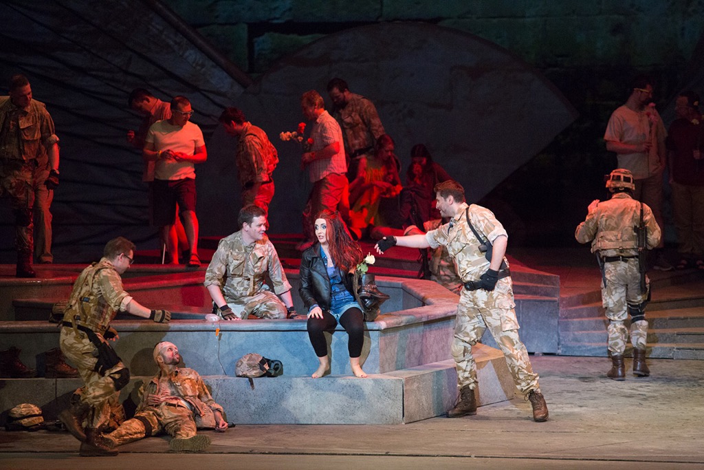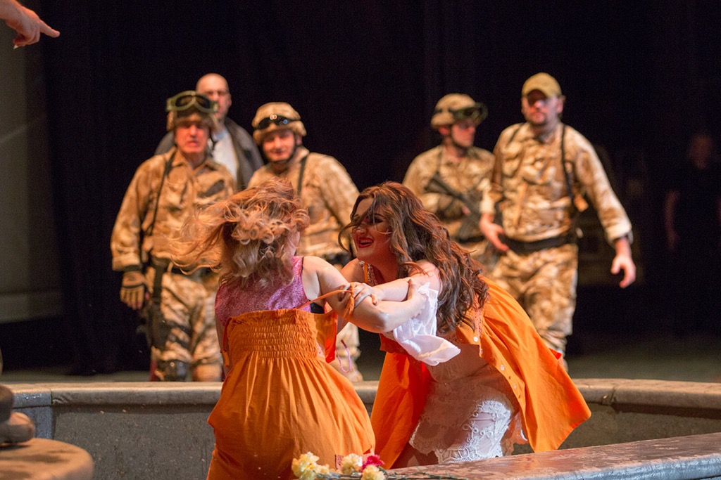 И в данном спектакле вызывает недоумение (исходя из современных реалий и элементарной логики) вопрос. Почему, арестовывая Кармен, её руки, как и полтора века тому назад, завязывают верёвкой, когда в арсенале современных военных имеются наручники? Или почему Цунига и Хозе дерутся на мечах, когда в арсенале современных военных их заменили более действенные боевые ножи?