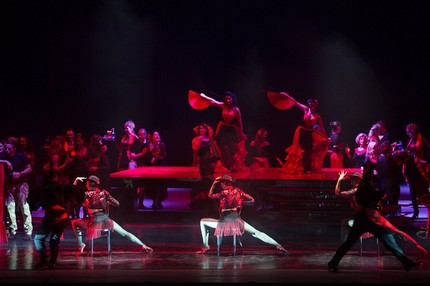Всё тот же антураж: парики-каре, милые шортики с неглиже, стулья, кричаще-красный диван-подиум, на котором, как королева бурлеска, восседала титульная героиня. Испано-цыганский антураж подчёркивался лишь алыми веерами и оборочками на таких же алых сорочках у танцоров. И глядя на этот блеск невольно возникает вопрос –