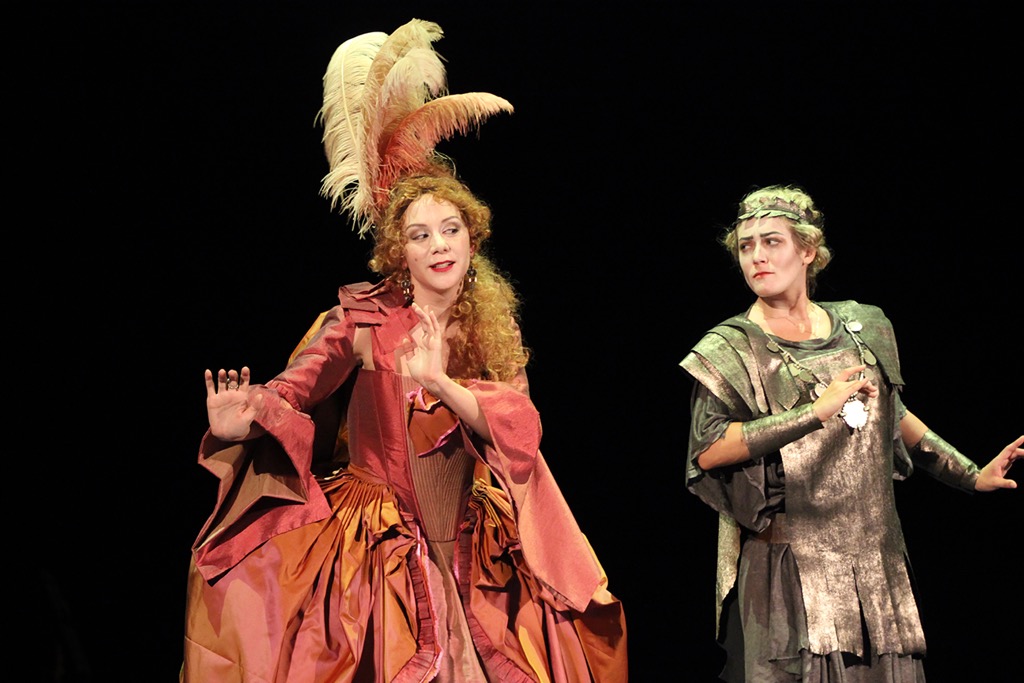 На музыкально-долгих тропинках спектакля актерские работы шестерки персонажей «собственных» – несчастных супругов (Цефала и по воле рока гибнущей от его стрелы Прокрис), безответно влюбленной в Цефала богини Авроры, безответно влюбленного в Прокрис Миноса, его вельможи и волшебника Тестора, а также Ерихтея (отца Прокрис) – в рамках эстетики барочного жеста вполне состоятельны. По замыслу Елизаветы I все шесть ролей на премьере исполняли дети-подростки: партия Прокрис была поручена женскому голосу, остальные – мужским. Теперь «секстет» – женский, так что Цефал, Минос, Тестор и Ерихтей становятся партиями-травести, а с партии Авроры травестийность снимается. В ней Варвара Турова вполне искусна, добротна, но по-настоящему растрогаться и плениться голосами пока заставляют лишь Елизавета Свешникова (Цефал) и Юлия Хотай (Прокрис).