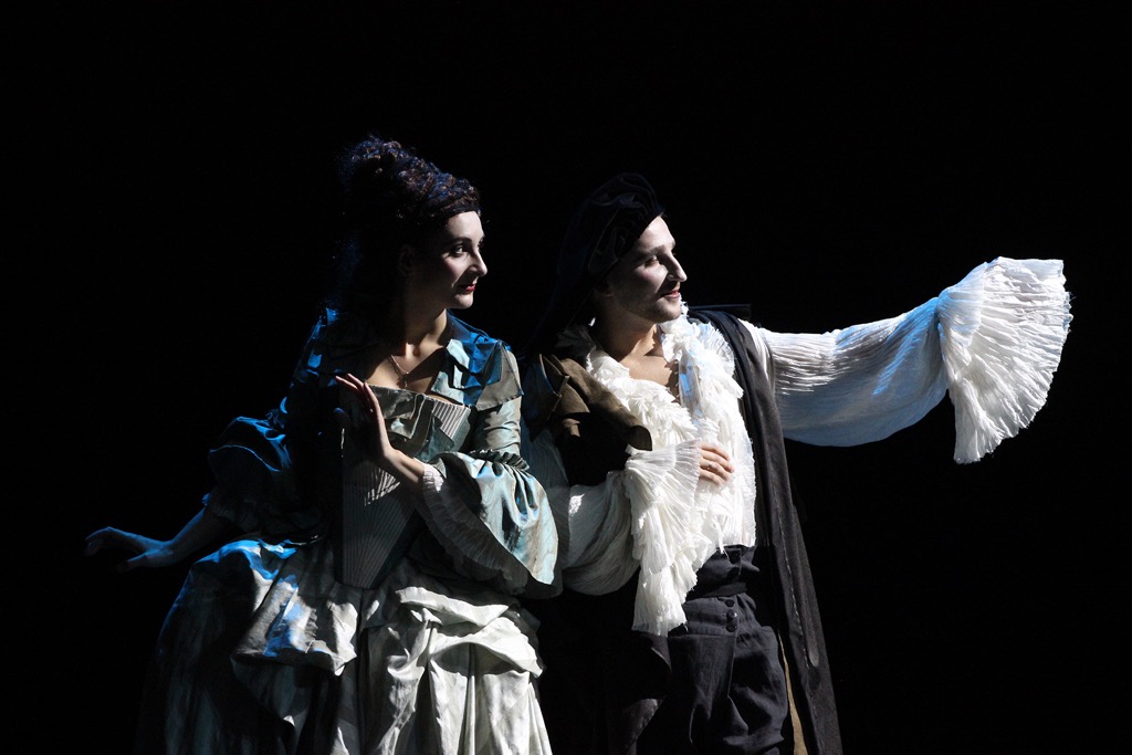 Световое оформление подчас создает даже некое подобие абстрактно-объемных очертаний и контуров, но главные театральные репера постановки – это роскошные, изумительные костюмы Ларисы Погорецкой, навевающие тонкий стилизованный аромат давно ушедшей эпохи, и система барочных жестов, к которой, выражая те или иные эмоции, с помощью режиссера-постановщика Данилы Ведерникова прибегают герои. Он и сам изумительный барочный артист, выходящий в балете-апофеозе спектакля в партии Орфея. Балет – венец каждого акта, и за отсутствием сведений об их музыке (сам Арайя балетов не писал) для всех подобрана музыка итальянского скрипача придворного оркестра Доменико Далолио (ок. 1700–1764), и скрипичная интерлюдия в начале II акта – его же. А глядя на экспрессивно-лаконичные эскизы режиссера в буклете спектакля, поразительно точно воспроизведенные на сцене с помощью «партитуры света», понимаешь: он не только режиссер, но еще и поразительно тонкий сценограф, предложивший за невозможностью недостижимого абстрактный, но весьма изящный и действенный театральный компромисс.