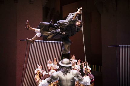 На протяжении спектакля ревнивая и своенравная Китри становится мягче. Совсем не ужасным оказывается Гамаш (Константин Целиков), в конце переодевшийся в женщину и тем самым вынудивший своего обидчика Дон Кихота (Карстен Юнг) поцеловать ему руку. Крадущий кур и рыб Санчо Панса (Николас Глэсман) здесь с монашеской тонзурой, хотя Сервантес с печально известной испанской католической церковью предпочёл не связываться.