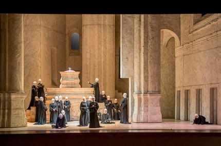 В гармонии с этими ощущениями оформление того же Джакомо Андрико. «Сестра Анжелика», как ей и положено, разворачивается под сводами церкви, и все в ней узнаваемо: своды, колонны, скамьи, решетки, кафедра. В церкви много воздуха, и цвета, используемые художником, деликатны. Монахини носят черное платье и белый головной убор, оставляющий открытым только лицо. В не оставляющее надежды только черное одета Княгиня, тетка Анжелики.