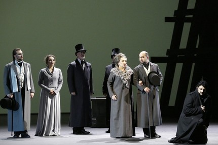 Ничего не значащий примитив абстрактной «геометрически-наборной» сценографии Адомаса Яцовскиса являет взору мрачную конструктивистскую коробку практически пустой, голой сцены. Как известно, сюжет либретто Модеста Чайковского по одноименной повести Александра Пушкина перенесен из первой половины XIX века в екатерининскую эпоху, то есть во вторую половину XVIII века, но скроенные по современному лекалу костюмы Марии Даниловой стилизованы, скорее, под XIX век либо даже под начало XX-го. Их цветовая гамма – не только черное, белое и «пятьдесят оттенков серого», но и неярко размытые цветные тона.
