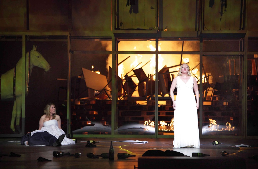 Мировое пожарище Валгаллы Кригенбург пространственно редуцировал. В объятом пламенем офисе Гибихунгов люди в панике пытаются спастись. На фоне катастрофы, в которой гибнут не боги, а миллионы людей, звучит завершающий монолог Брунгильды — звездный триумф непревзойденного вагнеровского голоса Нины Стемме. Возможно, таким образом Кригенбург артикулирует: «сумерки богов» сродни «сумеркам людей», мир уничтожения гармонии природы и моральных ценностей обречен. При этом режиссер не отходит от утопической веры Вагнера в идеал человека будущего.