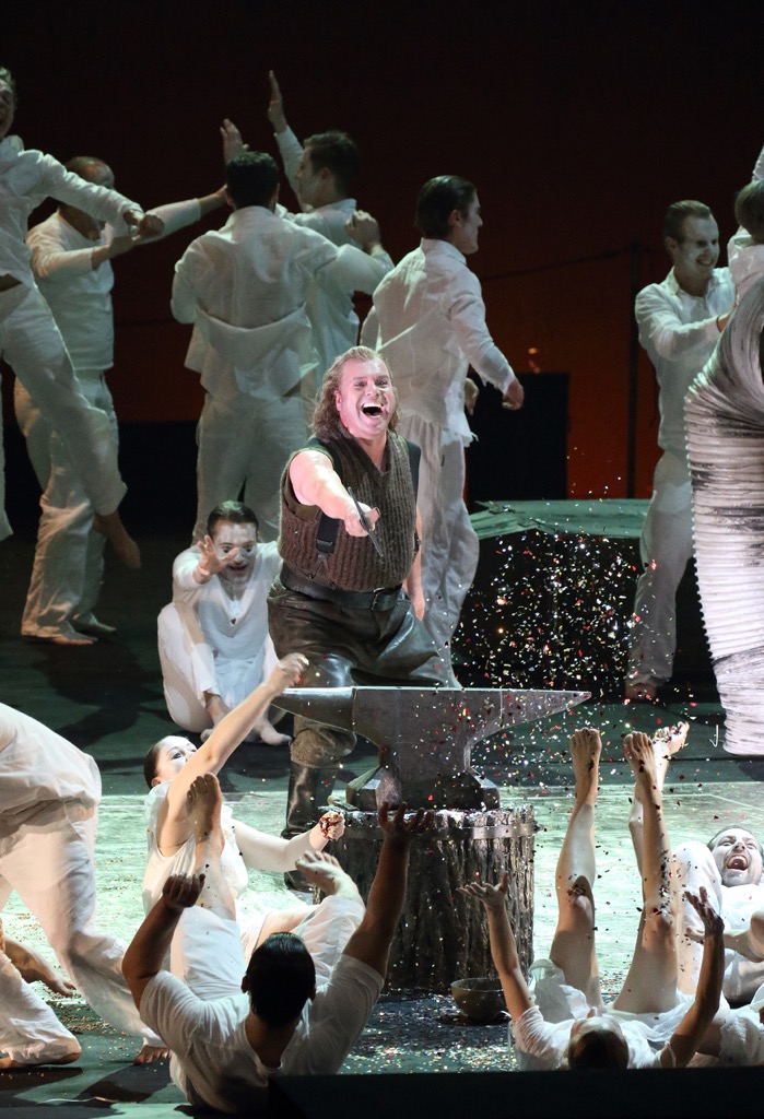 В тетралогии «Кольцо нибелунга» режиссер экспериментирует с архетипами мифологического сознания, с нарративом «коллективного рассказа», с драматургией «всеобщего действия», сознательно избегая внешних сценических атрибутов. При этом режиссер транслирует вагнеровские символы в театральной реальности человеческой пластики, движения, цвета, огня. Сценическую архитектонику спектакля создает чрезвычайный материал – живая, динамичная субстанция человеческого тела, обеспеченная участием более 100 статистов.