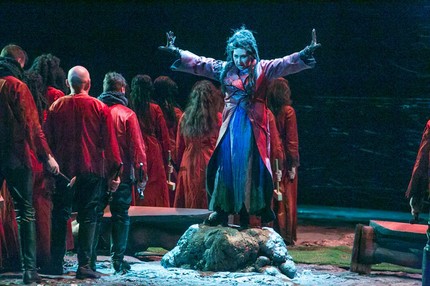 Режиссер-постановщик на сей раз берет на себя и функцию художника по костюмам, а в тандеме с ней выступают также знакомые нам по «Медее» сценограф (художник-постановщик) Ирина Сид и технолог по костюмам Ольга Сид. Их совместный визуально-постановочный замысел весьма органично – колоритно-мрачно и романтически горячо – поддерживает художник по свету Нарек Туманян. В итоге рождается спектакль, в котором подлинно гениальное драматическое бельканто Верди, по сути, слишком красивое для кровавого триллера, дышит легко и свободно. Вообще, задача поставить «Трубадура» крайне неблагодарна, ведь музыка с ее от первой до последней ноты волшебной мелодикой давно уже живет своей собственной жизнью, побеждая весьма запутанный сюжет, внятно пересказать который, согласно известной театральной легенде, не удалось еще никому…