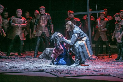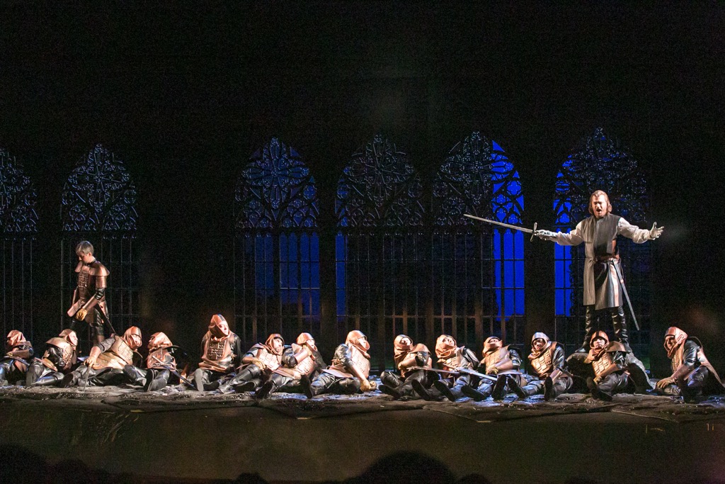 Именно таков новый спектакль. В нем нет объемных тяжеловесных декораций, а есть зловеще гнетущая рифленая фактура динамично трансформируемого задника. Это стихия сюжетного ноктюрна и пламени того самого жертвенного костра, который разожжен еще до открытия занавеса и на котором когда-то Старый граф ди Луна сгубил заподозренную в колдовстве против его младшего сына мать Азучены. Нет театральной «мебели», а есть скупая, но действенно самодостаточная рыцарская атрибутика с гербами и доспехами. Нет и монументально решенных локализаций картин, но есть единое поле реалистичной абстракции, рождающее иллюзию достоверности, которую мы и называем постановочной правдой. В сюжете «Трубадура» много алогичности, и, не пытаясь ее сгладить (да это и совершенно бесперспективно!), режиссер выстраивает действо как сквозную театральную сюиту, в которой правит бал не столько причинно-следственная сторона происходящих событий, сколько их символически-образное осмысление. При этом пространство сцены организовано поразительно масштабно: театр должен быть театром – им он и остается!