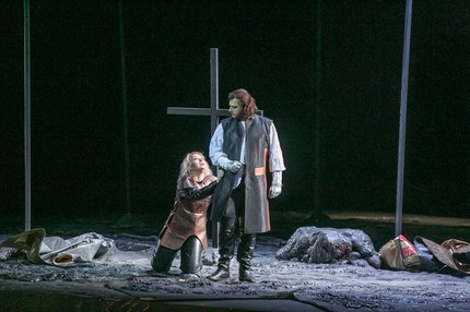 В реалистичную абстракцию спектакля вплетены и готические мотивы атмосферы эпохи сюжета. Это сцена в монастыре, куда собирается уйти, но не уходит Леонора, в последний момент выхватываемая Манрико из когтей Графа ди Луна. В том же интерьере (а не в замке Кастеллор, захваченном повстанцами во главе с Манрико, ведущим затяжную войну с Графом ди Луна) на сей раз разворачивается и сцена любовной идиллии Леоноры и Манрико. И смысл этого – в том, что, согласно режиссерскому «уточнению», до свадьбы с Леонорой «язычник» Манрико должен успеть принять христианство: теперь его затяжное противостояние с Графом ди Луна – ассоциация с конфликтом язычников и крестоносцев. Какая-либо чуждая «параллельность» (потенциальная надуманность) подобной линии в силу ее явной «продолжающей органичности» отсутствует, так что почему бы и нет?