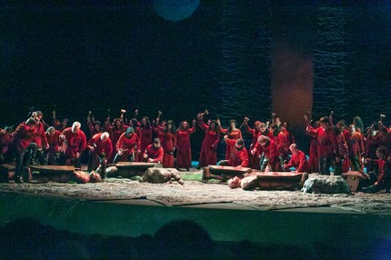 Но и музыкальный уровень рецензируемого спектакля, в котором задействован первый состав исполнителей (премьера – 25 ноября 2017 года), в целом, впечатляет не меньше. Поистине великолепен хор (хормейстер – Анна Сорокина)! С большим удовлетворением хочется отметить, что в спектакле он звучит не просто выразительно музыкально и мощно, как зачастую и поют оперы Верди, а интеллектуально акцентированно, с проявлением чувственного изящества, с тонкой нюансировкой. Оркестр под управлением музыкального руководителя и дирижера постановки Анатолия Чепурного профессионально добротен, музыкально пластичен и гибок, при этом спектакль идет со стандартным набором купюр, узаконенных еще в советское время музыкальной редакцией Большого театра. Конечно, жаль, но повода делать из этого «трагедию» нет. Единственное, что вызывает вопросы, – невероятно замедленные темпы, в которых (надо, однако, заметить) красóты музыки Верди раскрываются в новом довольно интересном созерцательно-философском аспекте…