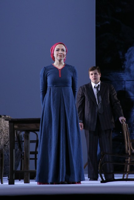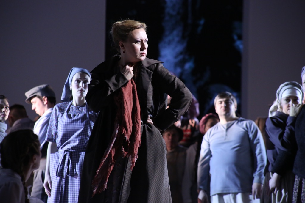 Довольно безобидную, не лишенную внешней эффектности, но так и не достигающую психологической глубины режиссерско-сценографическую «игру в оперу» в том же ключе неяркого созерцательного спокойствия поддерживают и удачно стилизованные «под эпоху» костюмы Елены Степановой, и постановка света Дамира Исмагилова, и, возможно, чуть экзальтированная хореопластика Ларисы Александровой, хотя в предложенную систему намеренно условных координат спектакля встраивается она вполне органично. Проживая из зрительного зала жизнь персонажей на сцене, подмечаешь, что мизансцены, лишенные напускной театральности, абсолютно естественны и понятны, а весь ансамбль певцов, исходя из задач новаторской для своего времени партитуры, положившей на музыку прозаические интонации народной жизни, прежде всего, – великолепные актеры, а уже во вторую очередь вокалисты-мелодекламаторы. Но при всей кажущейся, на первый взгляд, «простоте» вокального материала музыкально-драматические задачи перед певцами-солистами композитор ставит поистине колоссальные!