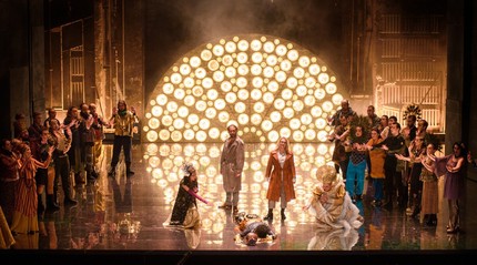 Если мир Фаэтона – это мир сомнений и теней, то дворец Солнца, куда он отправляется на поиски отца, это царство абсолютного света. Колонны-лучи спускаются с потолка, играя бликами. Золотое свечение неторопливо разгорается и заполняет сцену, а потом и весь зрительный зал. Яркий пластичный тенор Сирила Овити рисует образ уверенного и спокойного, щедро дающего свет и тепло бога Солнца.