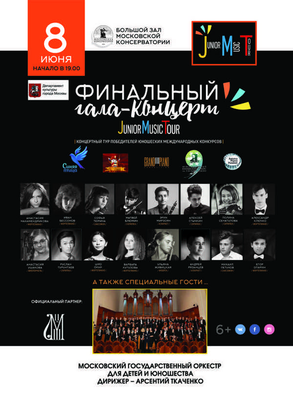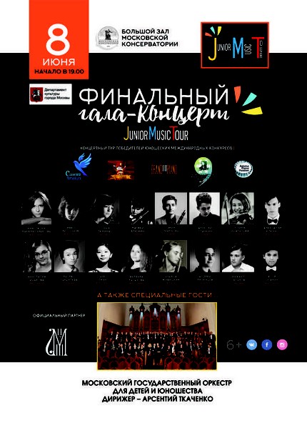 Финальный гала-концерт Junior Music Tour победителей международных юношеских конкурсов Grand Piano Competition, Юношеского конкурса им. П.И. Чайковского, Astana Piano Passion, а также телевизионных конкурсов «Синяя Птица» и «Щелкунчик» состоится в Большом зале Московской государственной консерватории им. П.И. Чайковского в сопровождении Московского государственного симфонического оркестра для детей и юношества, дирижер Алексей Чуйков.