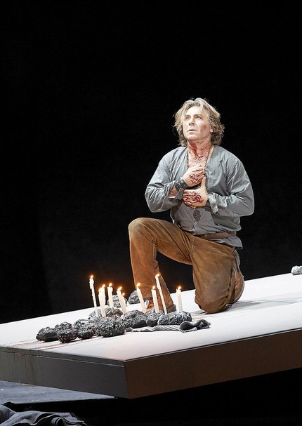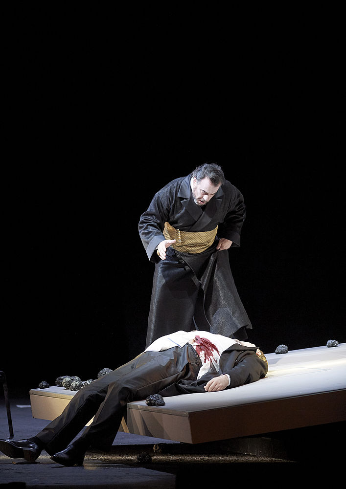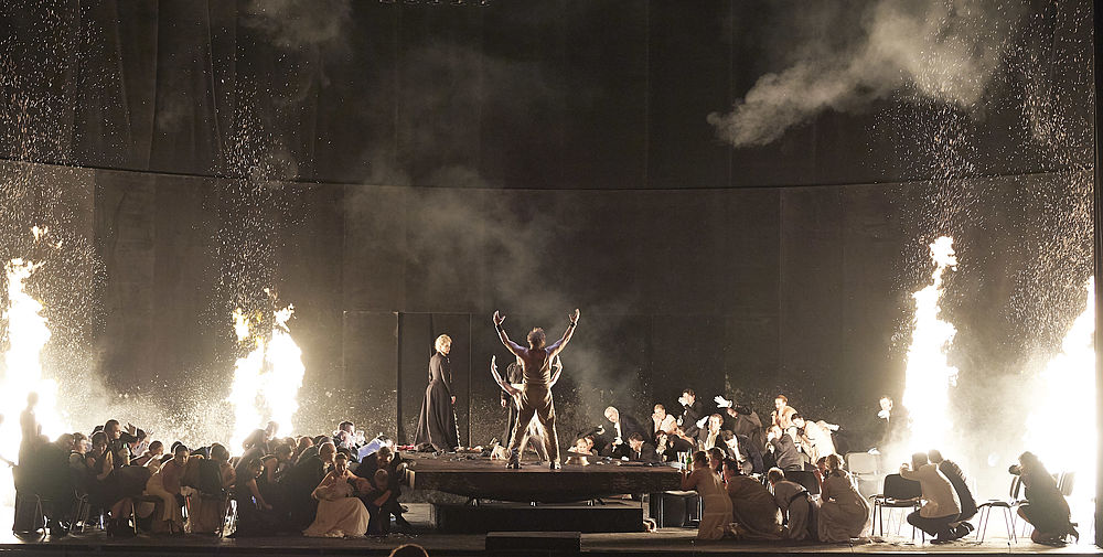 Ну, во-первых, это самое ничто: «чёрный зад в дыму туманном». Понятно, что машина по производству снега-ветра-и-тумана есть в каждом театре и должна себя как-то окупать, но, может быть, в таком театре, как Венская опера, есть ещё какие-то приспособления, кроме этой машины? Кинопроектор какой-нибудь или что-то такое, что помогло бы угадать, что спектакль создан в конце второго десятилетия не двадцатого века, а уже двадцать первого. Всё-таки одной воды сверху и четырёх факелов снизу немного мало. Мне думается, сегодня натянуть чёрный задник и напустить туману на все три оперных акта — приём, явно недостаточный, ибо это уже почти технологический анахронизм (если не кричащая сценической пустотой беспомощность оформителя). В принципе, можно сегодня снимать чёрно-белое кино (сегодня можно, наверное, делать вообще что угодно), но оно должно быть абсолютно гениальным, чтобы иметь смысл быть.
