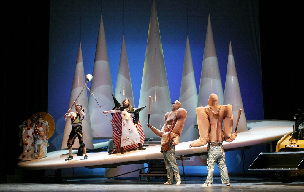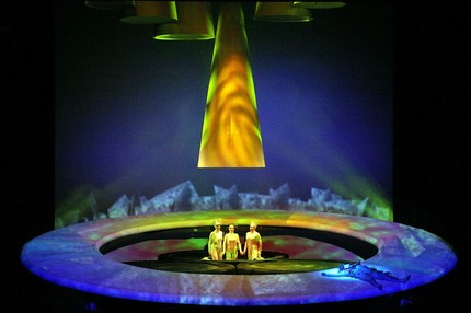 В этой продукции «Кольца», начинающейся, как обычно, под оркестровую медитацию игры рейнских вод, символ кольца постепенно возникает из темноты пустой сцены. В этой постановке русалки (дочери Рейна) прыгают на батуте, а валькирии выезжают на конях-ракетах, управляемых пилотами-статистами. Нибелунги, покоренные кольцом власти Альбериха, живут в упорядоченном измерении матрицы-резервации буквально «под кольцом», а великаны появляются в недвусмысленно «двухэтажном» облике. Отважные герои здесь наивны и благородны, боги капризны и непоследовательны, а лесная птичка, летающая с помощью подвески в чаще стальных сценографических конструкций, прелестна, словно ангел. В годину мрачных предвестий, настороженности и вселенского коварства вещие норны плетут нити судьбы в каком-то космическом челноке-центрифуге. Правитель страны Гибихунгов, доблестный Гунтер, – типичный интеллектуал эпохи Просвещения, а его грубые вассалы – ассоциация с сонмом летучих мышей. При этом символ кольца власти как визуальная доминанта проходит практически через всю постановку, что само по себе уже необычайно стильно, эффектно и зрелищно.