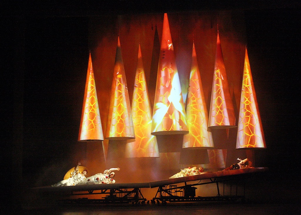 В качестве таких элементов-символов режиссер и сценограф прибегают к абстракции замкнутых геометрических форм. Это кольцо, конус и мандорла. Последний элемент – категория эзотерическая, особый вид нимба святого «в полный рост», свойственный иконописи: по-итальянски mandorla – миндальный орех, нечто похожее на вытянутую лунку миндалины (в обсуждаемой постановке фигурирует мандорла с заостренными окончаниями-вершинами). Такой «конструкционный» подход к сценографии придает ей действенную конструктивность. По словам режиссера, «это делает элементы пространства более динамичными, позволяет легко менять их повествовательные функции: например, кольцо может в разных ситуациях играть роль дороги, пещеры или ладьи».