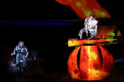 «Подвижная сценография, – снова обращаемся к режиссерской экспликации Пламена Карталова, – выполняет в театре ту же функцию, что в кино – смена точки съемки и монтаж, но я считаю, что актерам с ней работать даже легче, ведь декорации не отвлекают их от естественного хода музыкально-драматического исполнения, а наоборот помогают ему. Этот симбиоз актерской игры и сценического пространства был бы невозможен без активной работы со светом и спецэффектами, которая помогает удержать внимание зрителя на драматическом действии. Я уверен, что именно к этому стремился и сам Вагнер». И «венок» композитору с его портретом в дымке пустой сцены в финале, когда царство богов уже закатилось, а царство людей после такого вселенского катаклизма словно замерло в вопросительном ожидании, служит важной режиссерской ремаркой. Сей «эпилог» возвращает нас от мифа к жизни, от средневековой легенды к романтизму XIX века, который, в сущности, и есть краеугольный камень всей постановочной концепции.