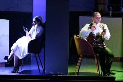 Режиссёр Альфонсо Ромеро Мора несколько утрирует, вплоть до крика, вокальные акценты и тем самым делает, возможно, более очевидной для современного зрителя скрытые в музыке Россини и в либретто эмоции. Бесконечные селфи и позирование на камеру; общение дочери и отца, сидящих в соседних комнатах, посредством смартфона; заседание с телефонам зубах в туалете; смартфон-запрет как худшее наказание для непослушной дочери, лёгкий стриптиз в массажном кабинете – вроде бы, не так и оригинально, но поставлено смешно и иронично, а каждый сценический образ умело выстроен и пластически отточен.