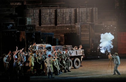 Перенос в тридцатые годы минувшего столетия никак не повлиял на драматургию, которая осталась нетронутой. Все развернулось честь по чести, согласно развитию классического либретто Мельяка и Галеви, без изобретения каких бы то ни было смыслов, о которых сотрудники Бизе не подозревали. Просто вся история была разодета в иные одежды; впрочем, без традиционных атрибутов Испании не обошлось: желто-красные флаги полыхали в ночном небе, справа и слева танцовщики исполняли несложные движения (хореография Леды Лойодиче), а артисты старательно восклицали «оле!». Кто франкисты, а кто республиканцы, идут ли военные действия или конфликт только тлеет, осталось непрояснённым.