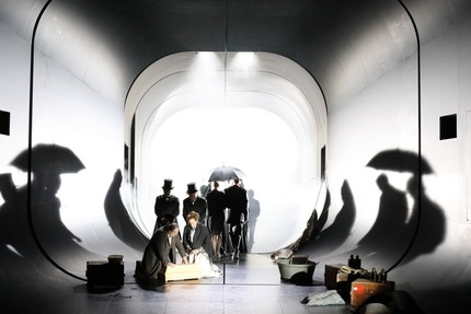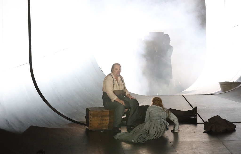 Прежде всего, хотелось бы поделиться двойным удивлением, связанным с самой постановкой. Во-первых, изрядно порадовала голландский режиссёр Лотте де Бир, представившая пуччиниевский «Триптих» не в русле своих традиционных извращений (Инстаграм в «Травиате», sms-голосование в «Искателях жемчуга» и т.п.), а в русле абсолютно традиционной костюмированной режиссуры (во всяком случае, мизансценная структура отличалась безупречным аутентизмом). Во-вторых, вся режоперная актуализация, уместившаяся в сценографическом горлышке гигантской мясорубки, настолько метко, чётко и лаконично сработала на решение задачи объединения несопоставимого, что единственное слово, которое вертелось в голове после завершения первой же части «Триптиха» («Плаща»), — «гениально».