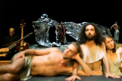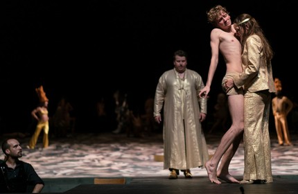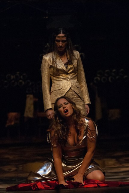 костюмы выполнены брэнд-дуэтом «Лемм-и-Барки»). Певицы действительно и звучат, и двигаются феерично: Тамара Банесевич (Фортуна), Анна Квинтас (Добродетель) и Леа Десандр (Амур) создают изумительный по своей инфернальности сволочной ансамбль бесноватых в иступлённом самолюбовании мифических «блондинок». К слову, это карнавальное перевёртывание сил небесных с ног на голову находит отражение и в сценографии: всё действие происходит на планшете, расписанном как ренессансный плафон, то есть у зрителя сразу возникает ощущение, будто на сцену уронили потолок.