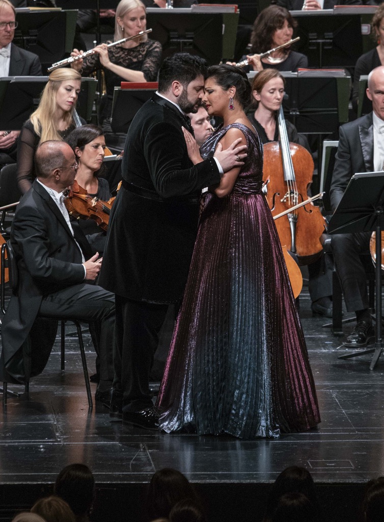 Как известно, «плюс» на «минус» даёт минус практически всегда; в лучшем случае мы имеем «ноль», но чаще всего — именно минус. Прошлогоднее блестящее выступление Нетребко в «Аиде» было обусловлено особой атмосферой, кропотливой работой, ответственностью перед ролью и перед Риккардо Мути, который буквально истязал «персонал», прогоняя один и тот же акт целиком по нескольку раз. Юсиф Эйвазов спел тогда два спектакля без супруги во втором составе.