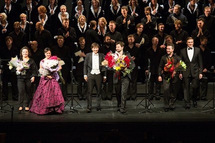 Музыкальная аура этого проекта предстает настолько сильной, что в финале публика устраивает исполнителям грандиозную овацию, не присоединиться к которой для автора этих строк решительно невозможно! Душа и цементирующий базис всего музыкального здания проекта – маэстро Андрей Лебедев. К великой русской партитуре бельканто дирижер обращается впервые, но это обращение – поистине его звездный час: партитура и дирижер счáстливо находят друг друга! Его союзница, не менее музыкально-вдумчивая и компетентная, чем он, – главный хормейстер театра Юлия Сенюкова. Работа оркестра и хора великолепны: эпичность и мощь истинно русского интонационного посыла, масштаб рельефно-собранного звучания ювелирно точно коррелируют с рафинированной ажурно-белькантовой орнаментацией виртуозных ансамблевых и сольных вокальных номеров.