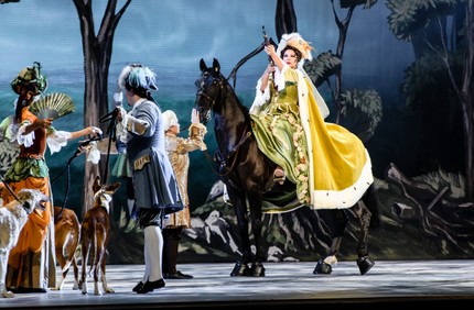 Два акта нового балета – два полюса пышного многоцветья лета и «хрустального» холода зимы, а сцены спонтанно сменяют друг друга безо всякой логической мотивации. Первая – аллегория влюбленных Шута и Шутихи в райском саду, которых Ангел (почему не Амур?) ранит своей волшебной стрелой. Вторая – потрясающе зрелищная сцена царской охоты с настоящими скакунами: в ней впервые появляется Анна Иоанновна. Третья сцена застает императрицу в Зимнем дворце: в череде важных государственных дел она издает указ о создании «танцовальной» школы по запросу обосновавшегося в России француза Жана-Батиста Ланде, которому история уготовала роль основоположника русской хореографии (такая школа – ныне Академия русского балета имени Вагановой – была основана в 1738 году). Первый дивертисмент балета – сцена домашнего театра с воспитанницами школы. Четвертая сцена – большой дивертисмент, театрализованное представление с вереницей персонажей в дворцовом парке в присутствии императрицы, к которому подключаются влюбленные Шут с Шутихой. Умиляясь их отношениями, Анна Иоанновна объявляет о свадьбе, приказывая построить для этой пары ледяной дворец на Неве, а Оперная дива с высоты солнечного диска поет оду во славу императрицы.