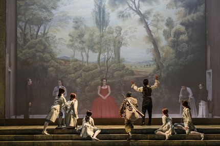 Дирижер Риккардо Менази обеспечил высокое музыкальное качество спектакля, небольшой оркестр давал нежный округлый звук. К слову, всё-таки звучание, приближенное к аутентичному барочному, может быть и не должно являться идеалом. Возможно, барочные композиторы были бы и не против ориентироваться на современный по составу оркестр, а барочные музыканты как раз-таки хотели бы иметь в своем распоряжении инструменты, позволяющие извлекать более сильный и чёткий звук. Тем самым они могли бы соперничать со сценической мощью барочного театра и немного заглушать разговоры в зале, а не служить, скорее, легким фоном для всего этого великолепия.