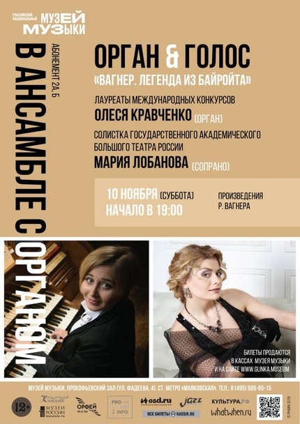 10 ноября на сцене Прокофьевского зала Российского национального музея музыки состоится концерт абонемента «В ансамбле с органом». Известные музыканты, лауреаты международных конкурсов, солистка Большого театра России сопрано Мария Лобанова и органистка Олеся Кравченко подготовили для московской публики уникальную программу «Вагнер. Легенда из Байройта». В концерте прозвучат признанные шедевры Р. Вагнера — «Пять песен на стихи Матильды Везендонк», арии из опер «Лоэнгрин», «Тангейзер» и «Летучий голландец». Также в программе — транскрипции оркестровой музыки Вагнера для органа соло, в которых в полной мере раскроется оркестровый потенциал инструмента.